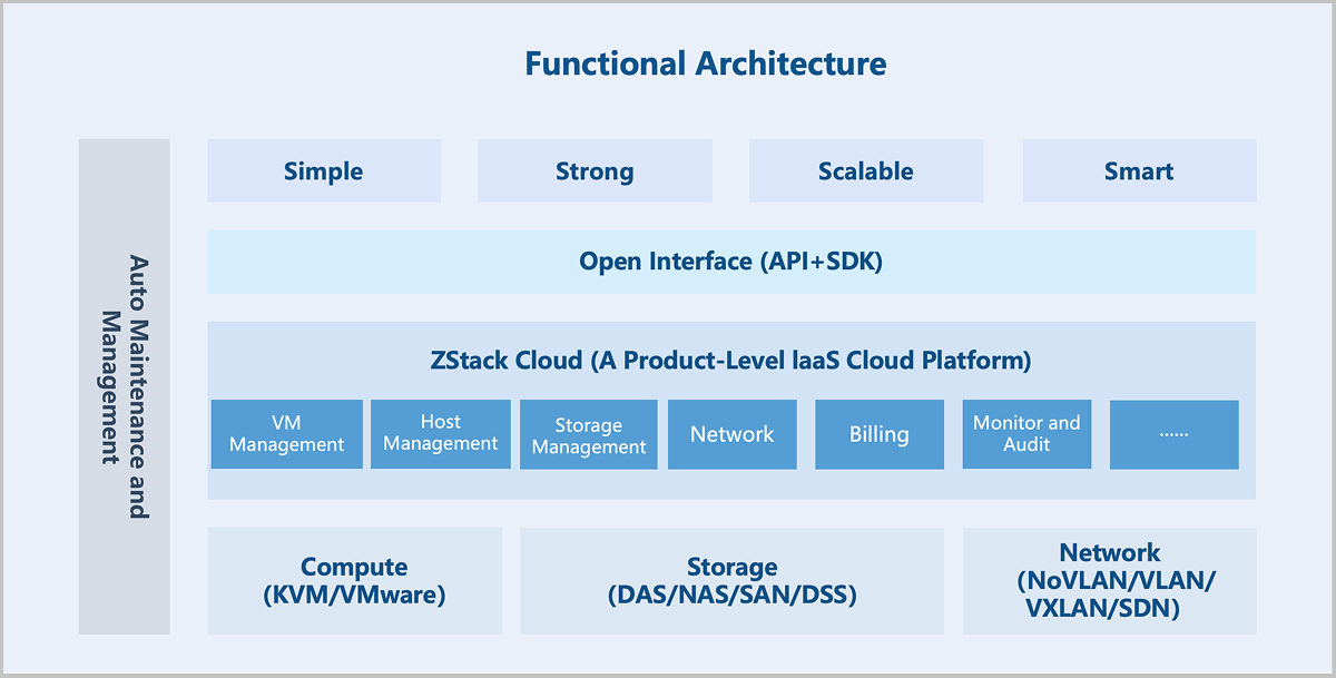 ZStack Cloud helps enterprises better manage their infrastructure resources, such as the compute, storage, and network resources, in their data centers. The bottom layer of ZStack Cloud supports both KVM and VMware virtualization technologies. In addition, ZStack Cloud supports various storage types, such as DAS, NAS, SAN, and DFS. To be more specific, local storage, NFS storage, SAN storage, and distributed block storage are supported. ZStack Cloud also supports various network models, such as VLAN and VXLAN.