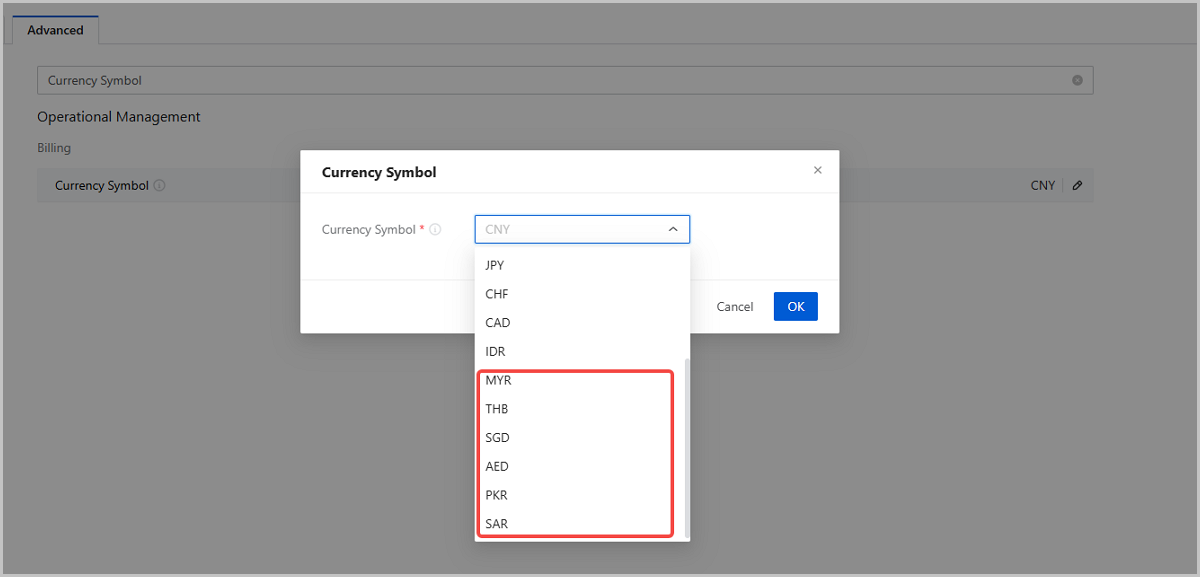 Starting from ZStack Cloud5.5.0, support for the following billing currency types has been added: UAE Dirham (AED), Malaysian Ringgit (MYR), Pakistani Rupee (PKR), Saudi Riyal (SAR), Singapore Dollar (SGD), and Thai Baht (THB).