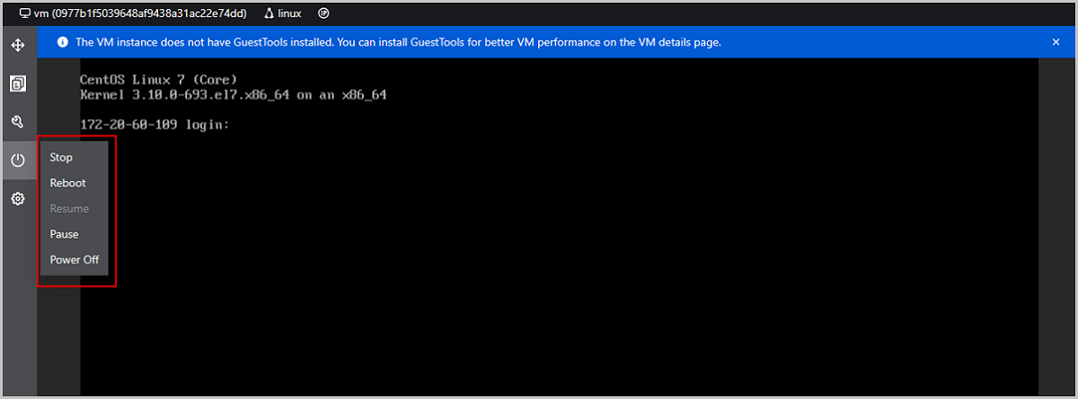 Starting from ZStack Cloud 5.0.0, VM power managements are supported on VM console pages, which effectively improves the VM O&M efficiency. Supported operations now include stopping, rebooting, resuming, pausing, and powering off VM instances.