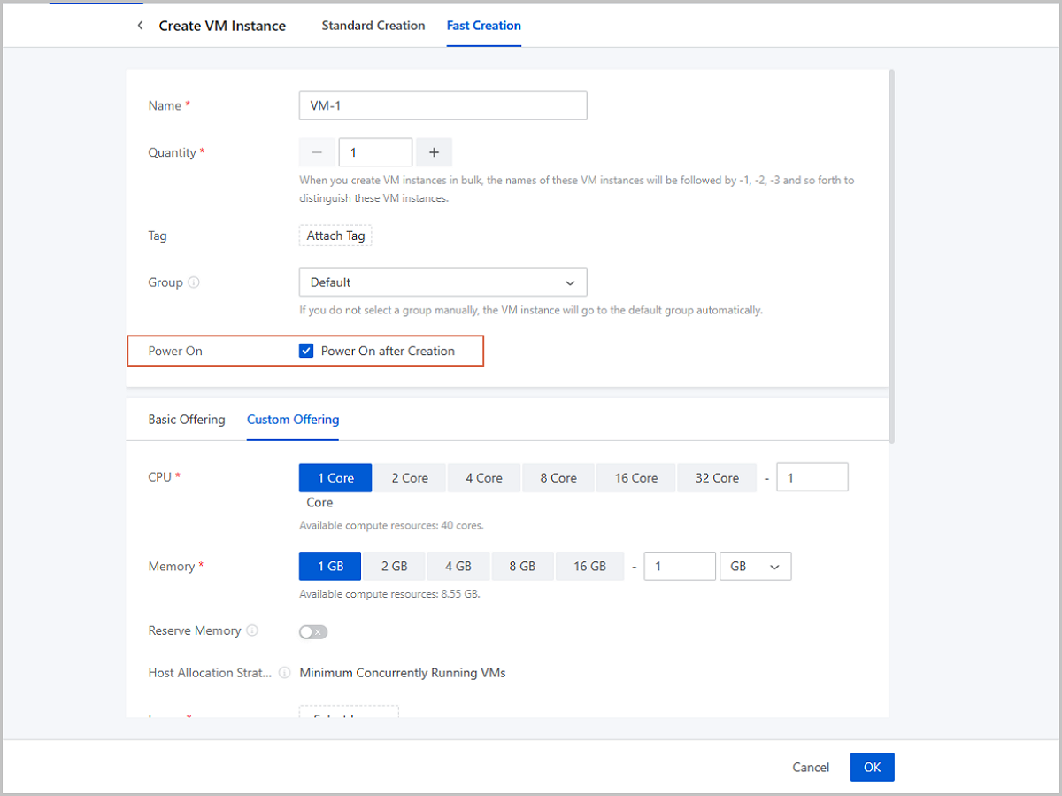 ZStack Cloud 5.0.0 adds a parameter Power On on VM creation pages. With this parameter, you can define whether power on a VM instance automatically after it is created.