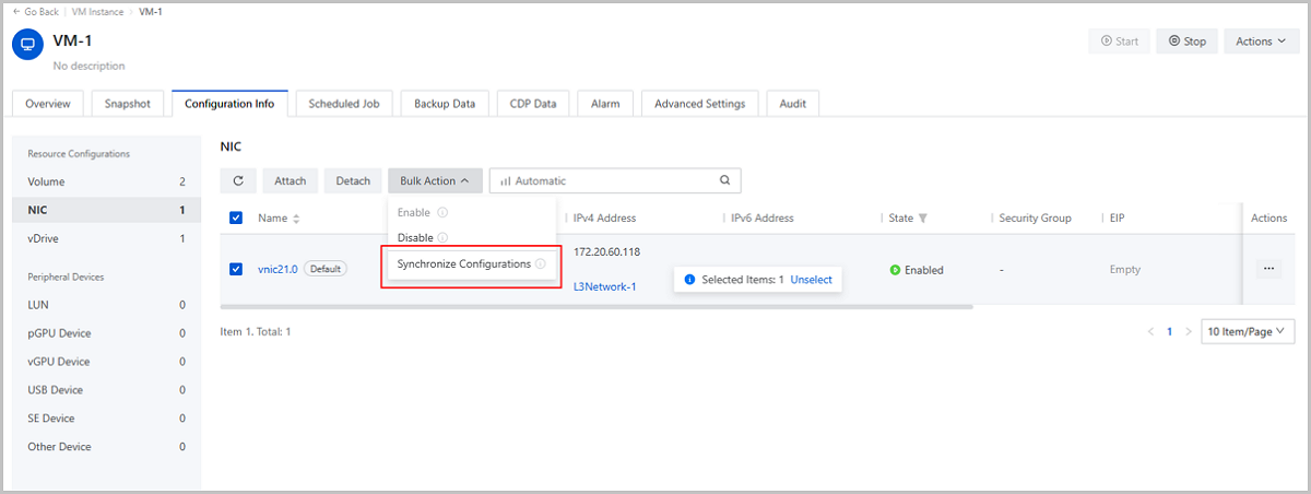 Starting from ZStack Cloud 4.7.11, in addition to IPv4 addresses, the GuestTools realizes IPv6 syncs and reading. After assigning an IPv6 address to a VM NIC that uses a network without the DHCP service on the Cloud, you can click Synchronize Configurations on the NIC action list to sync the IPv6 to the NIC and take effect.