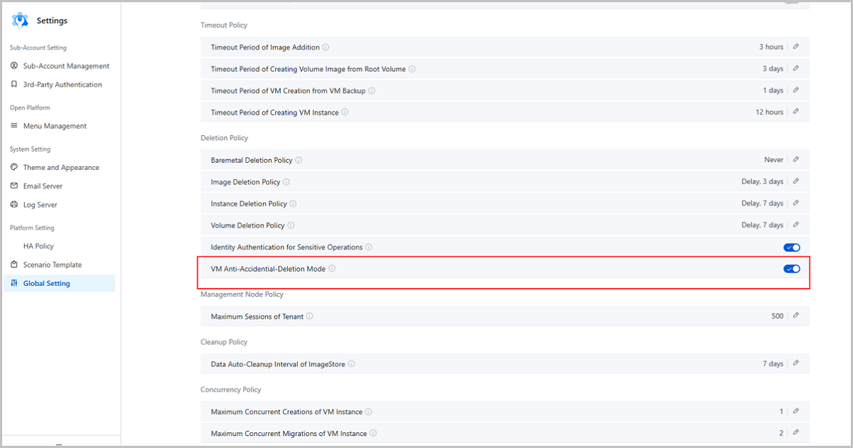 ZStack Cloud 4.7.11 provides a new global switch: VM Anti-Accidental-Deletion Mode. You can turn on/off this switch in .