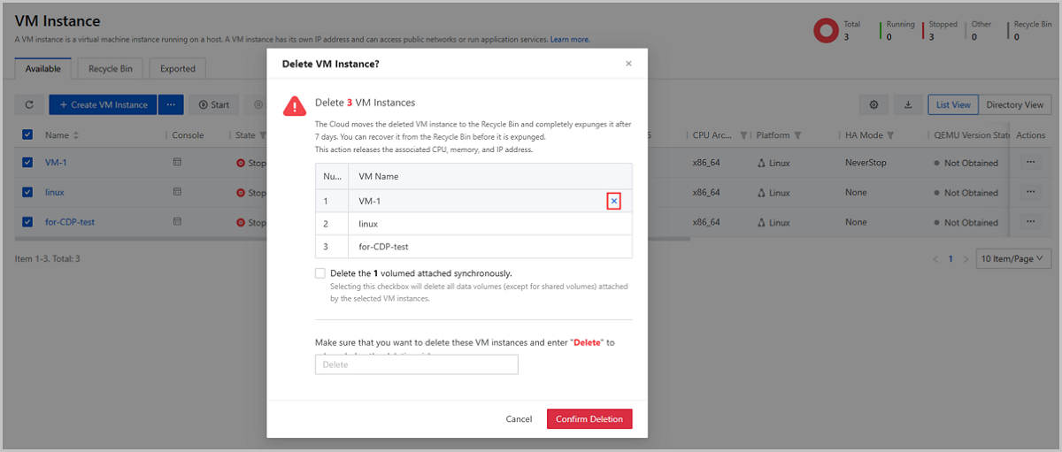 Starting from ZStack Cloud 4.7.11, you need to carefully read the risk notes and manually enter the text "Delete" to acknowledge these risks before you can make a VM instance deleted or expunged.