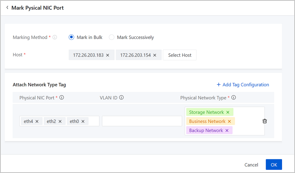 On the Physical Network page, you can attach network-type tags to a physical NIC port to mark the type of the network it resides on. Currently, five network-type tags are supported: Management Network, Storage Network, Business Network, Backup Network, and Migration Network. The management network tags are attached to corresponding ports automatically by the system and other tags are attached by yourself.