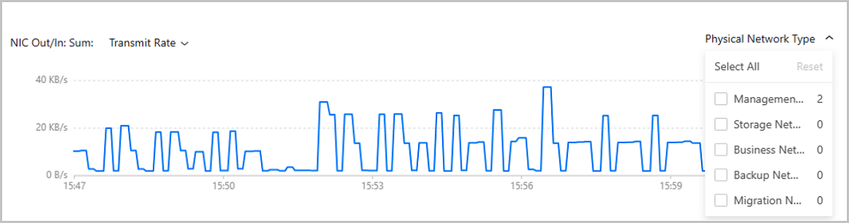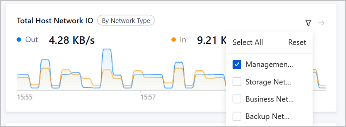 Host Details Page: The host details page provides a NIC chart. The chart monitors the out/in situation of all physical NIC ports on this host. You can specify one or more network types to view the data only of the corresponding NIC ports.
