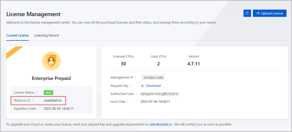 Starting from ZStack Cloud 4.7.11, the Cloud adds a platform ID on the License Management page as a product unique code for users to query.