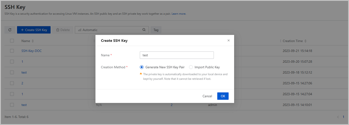 On this page, you can click Create SSH Key to generate a new SSH key pair directly or import an SSH public key to the Cloud.
