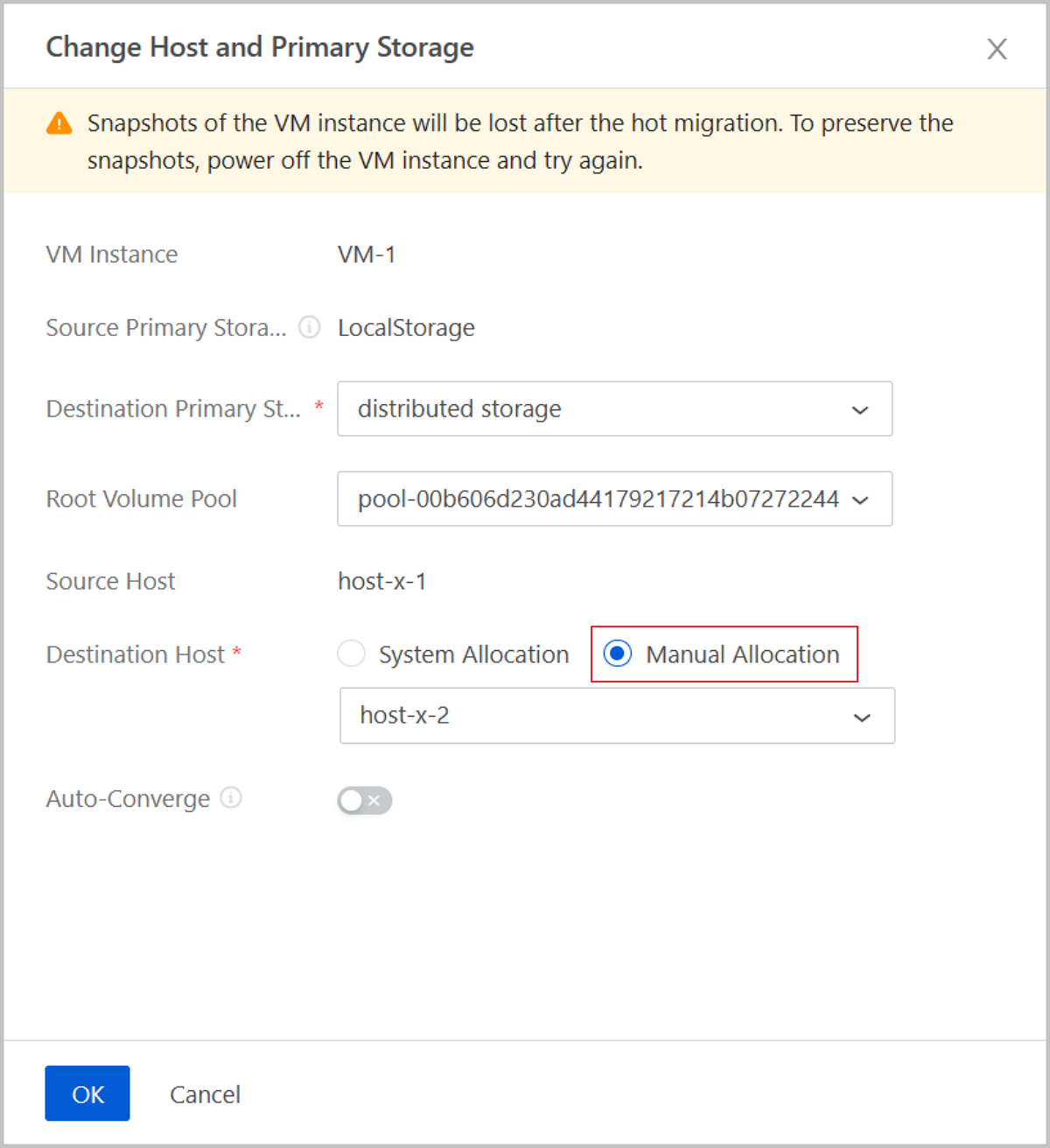 In earlier versions, when migrate a VM instance (Change Host and Primary Storage), the Cloud only supports system allocation for destination host. Starting from ZStack Cloud 4.7.21, when you hot migrate a VM instance by Change Host and Primary Storage, you can select Manual Allocation to specify a destination host. The Cloud will filter available hosts for you based on the selected destination primary storage.