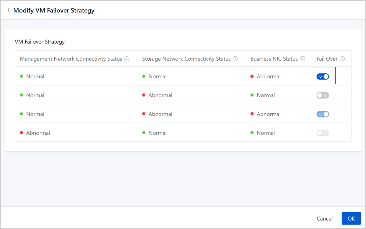 Starting from ZStack Cloud 4.7.0, the Cloud allows you to enable/disable the HA policy for all VM instances on the cloud with one click. If you enable the HA policy, you can then configure the failover strategies for VM instances simply by editing a truth table. The failover strategies cover abnormal scenarios concerning the management network connectivity status, storage network connectivity status, and business NIC status.