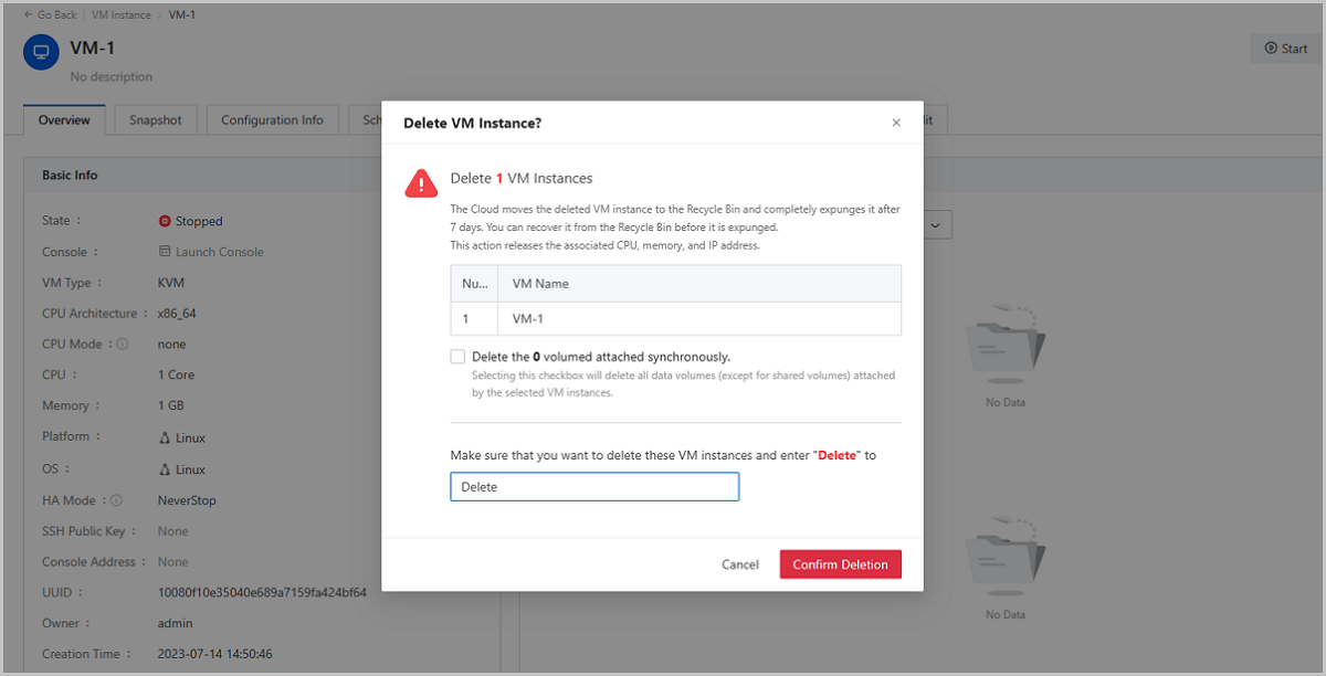 ZStack Cloud 4.7.11 optimizes the VM deletion mechanism, helping reduce your risk of deleting resources wrongly and better ensure your business stability and data security. The following are optimization contents: