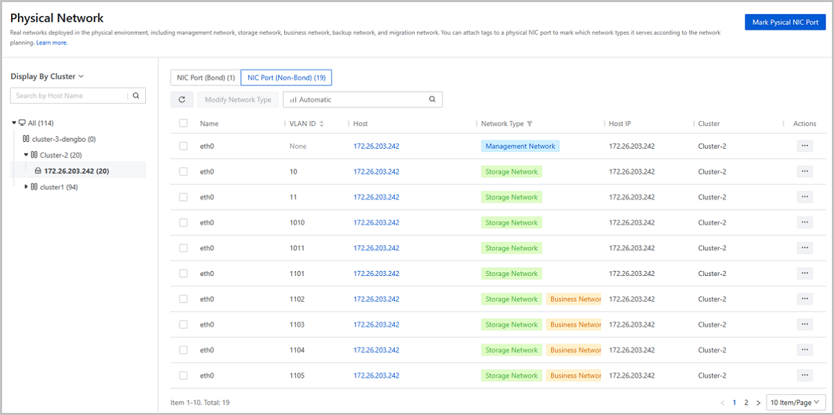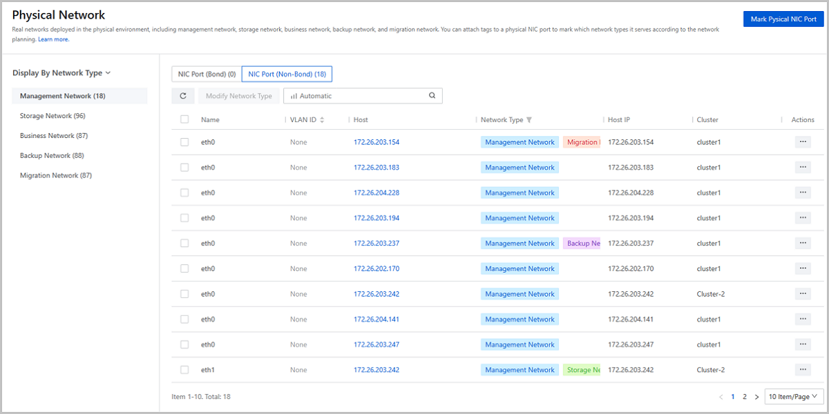 On the Physical Network page, you can attach network-type tags to a physical NIC port to mark the type of the network it resides on. Currently, five network-type tags are supported: Management Network, Storage Network, Business Network, Backup Network, and Migration Network. The management network tags are attached to corresponding ports automatically by the system and other tags are attached by yourself.