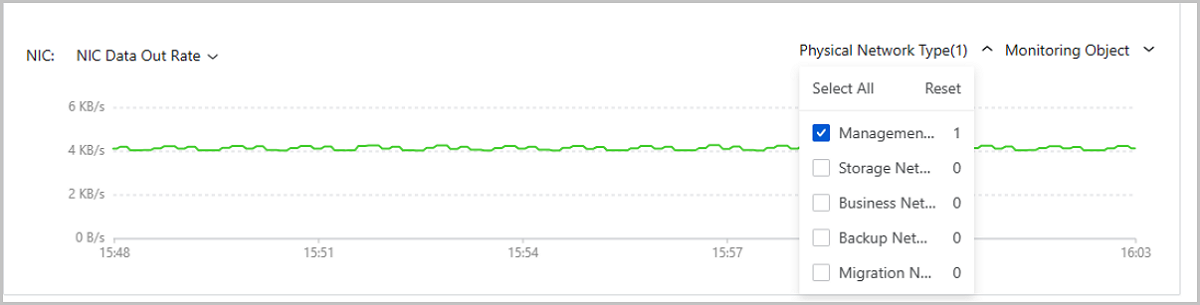 Host Details Page: The host details page provides a NIC chart. The chart monitors the out/in situation of all physical NIC ports on this host. You can specify one or more network types to view the data only of the corresponding NIC ports.