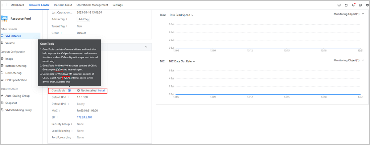 For example, if you create a VM instance using the network that is not enabled with DHCP service, you need to install the GuestTools after VM creation and manually sync the network configurations to the NIC. This way, the specified parameters on the Cloud will be deployed to the NIC and take effect.