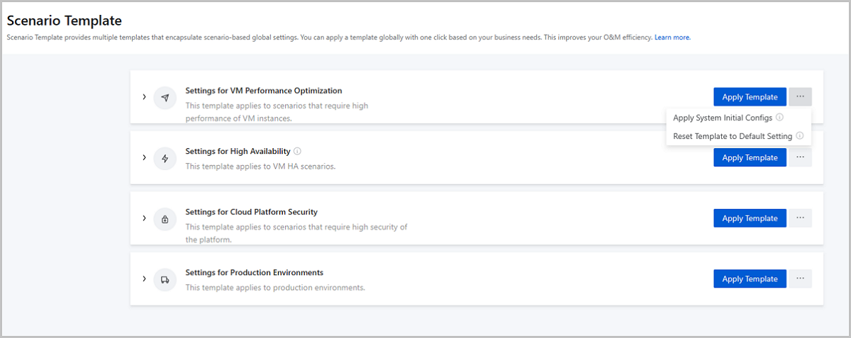 In earlier versions, ZStack Cloud provides scenario templates that encapsulate scenario-based global settings. You can apply a template globally with one click based on your business needs. This improves your O&M efficiency.