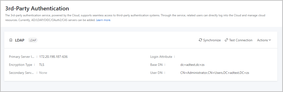 Starting from ZStack Cloud 4.6.0, Enterprise Management has reorganized and optimized the process of adding different types of 3rd-party authentication servers to improve user experience.