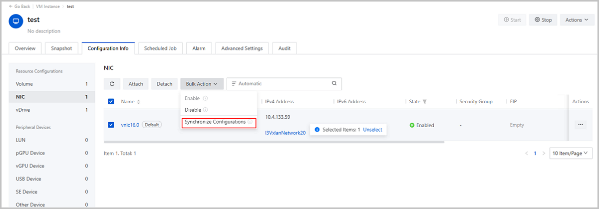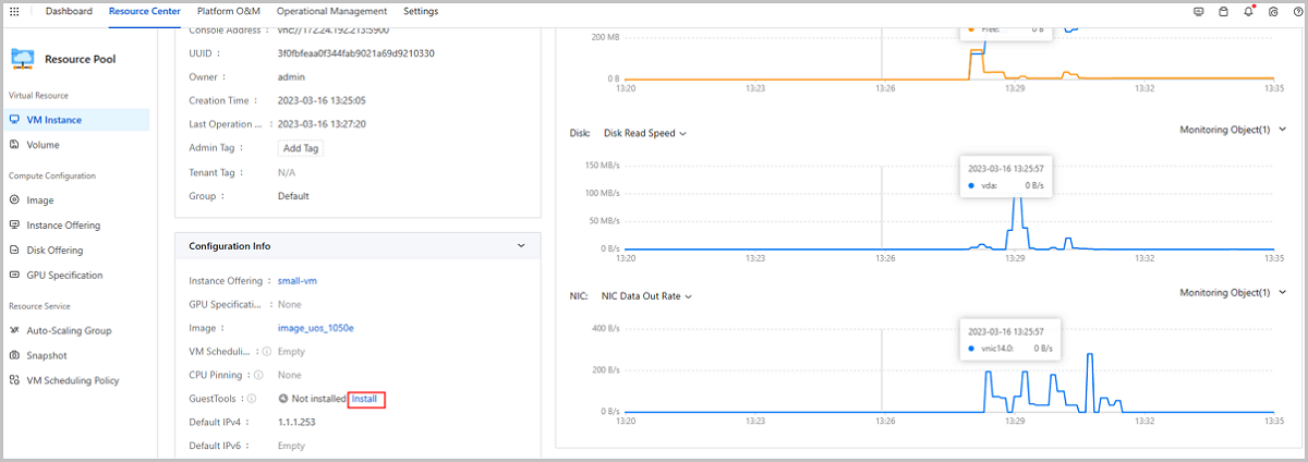 For example, if you create a VM instance using the network that is not enabled with DHCP service, you need to install the GuestTools after VM creation and manually sync the network configurations to the NIC. This way, the specified parameters on the Cloud will be deployed to the NIC and take effect.
