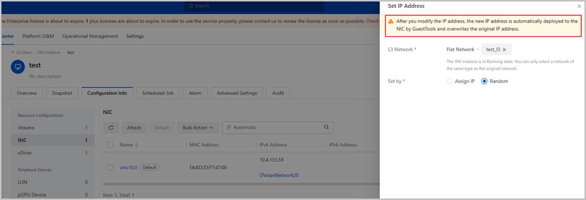 In addition, if you attach a NIC to or change the NIC IP address for a VM instance installed with GuestTools, the configurations can be automatically deployed to the NIC by QGA. You do not need to run commands in VM console to restart its DHCP service to make configurations take effect.