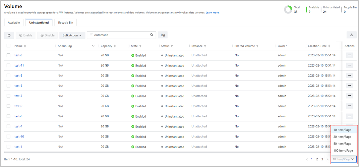 In earlier versions, ZStack Cloud allows you to customize the items to be displayed on a resource list. The specified number of items per page is only for one-time use and will be restored to default value after you refreshing or re-entering the resource page.