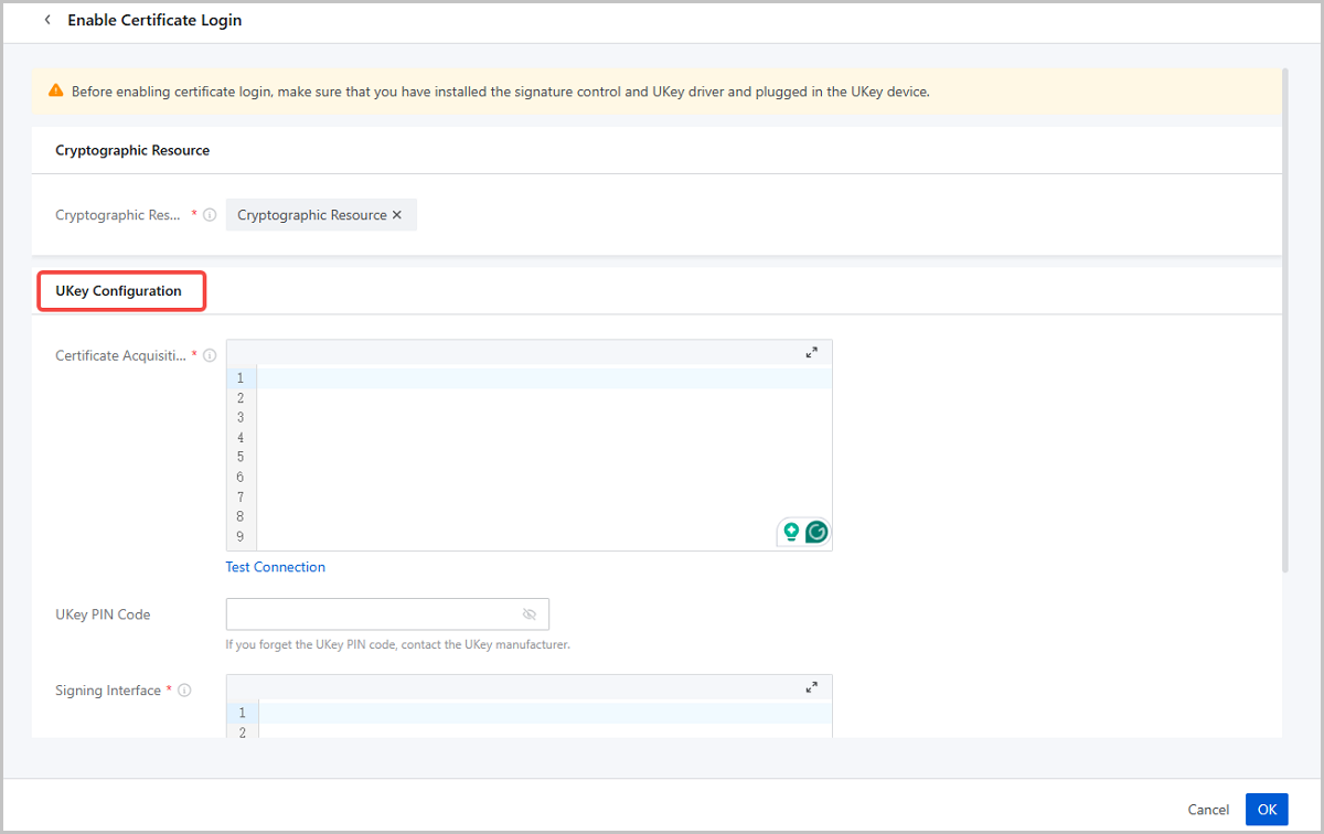 ZStack Cloud 5.3.28 allows you to fill in UKey integration information when enabling Certificate Login with plugin-based cryptographic resources, including the UKey's certificate acquisition interface, signing interface, and the UKey PIN. This flexibility allows you to use various UKey devices for certificate login based on your needs, rather than being limited to UKey devices specified by the Cloud.