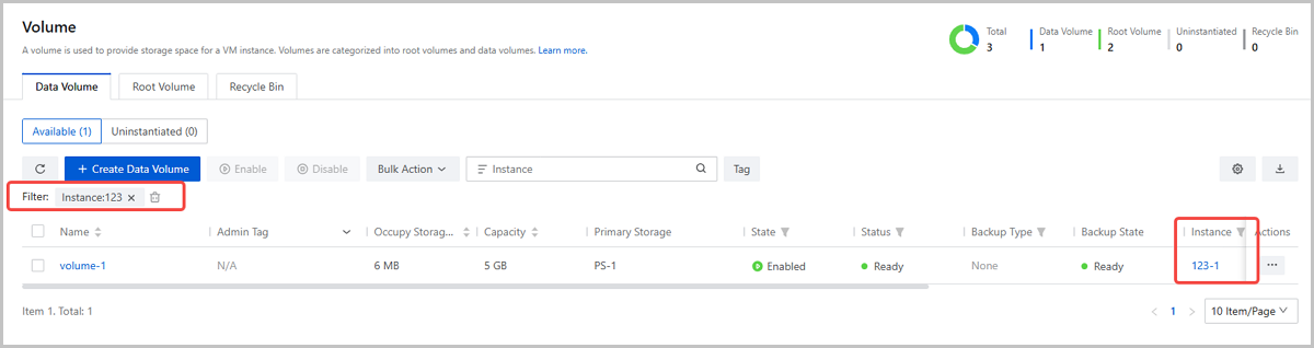 ZStack Cloud 5.3.28 supports filtering data volumes by instance, allowing you to quickly locate data volumes attached to a specified instance.