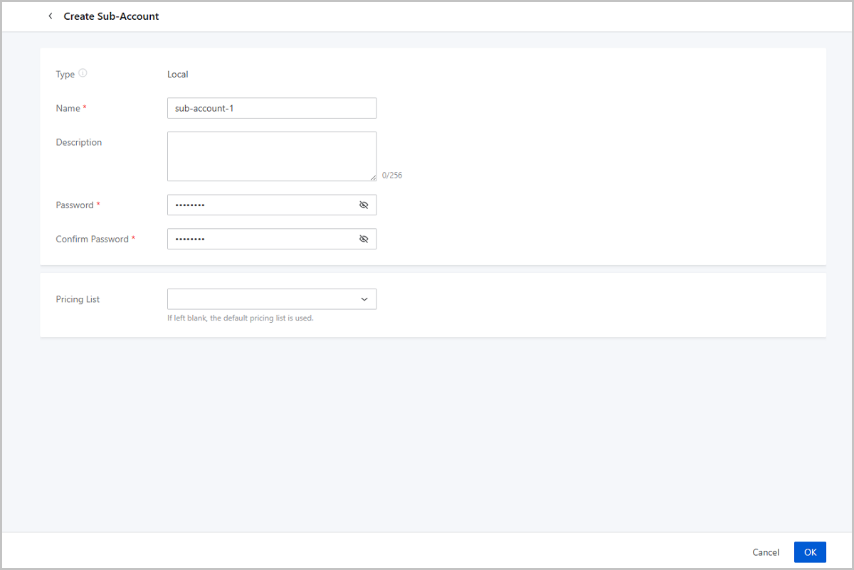 On the main menu of ZStack Cloud, choose . On the Sub-Account page, click Create Sub-Account. Then, the Create Sub-Account page is displayed.