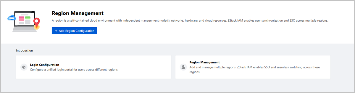 A region is a self-contained cloud environment with independent management node(s), networks, hardware, and cloud resources. ZStack IAM enabled user synchronization and SSO across multiple regions.