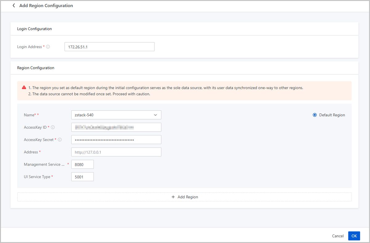 | Modify Region Configuration | Modify the region information, such as the AccessKey, address, management service port, and UI service port. |