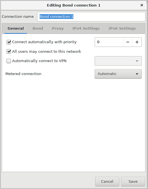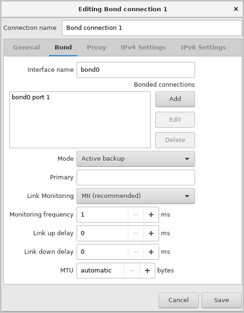 From the Mode drop-down list of the Bond tab, select the bond mode as need, such as Active backup. Then, configure settings or use the default settings for the other parameters. After you complete the settings, click Save.