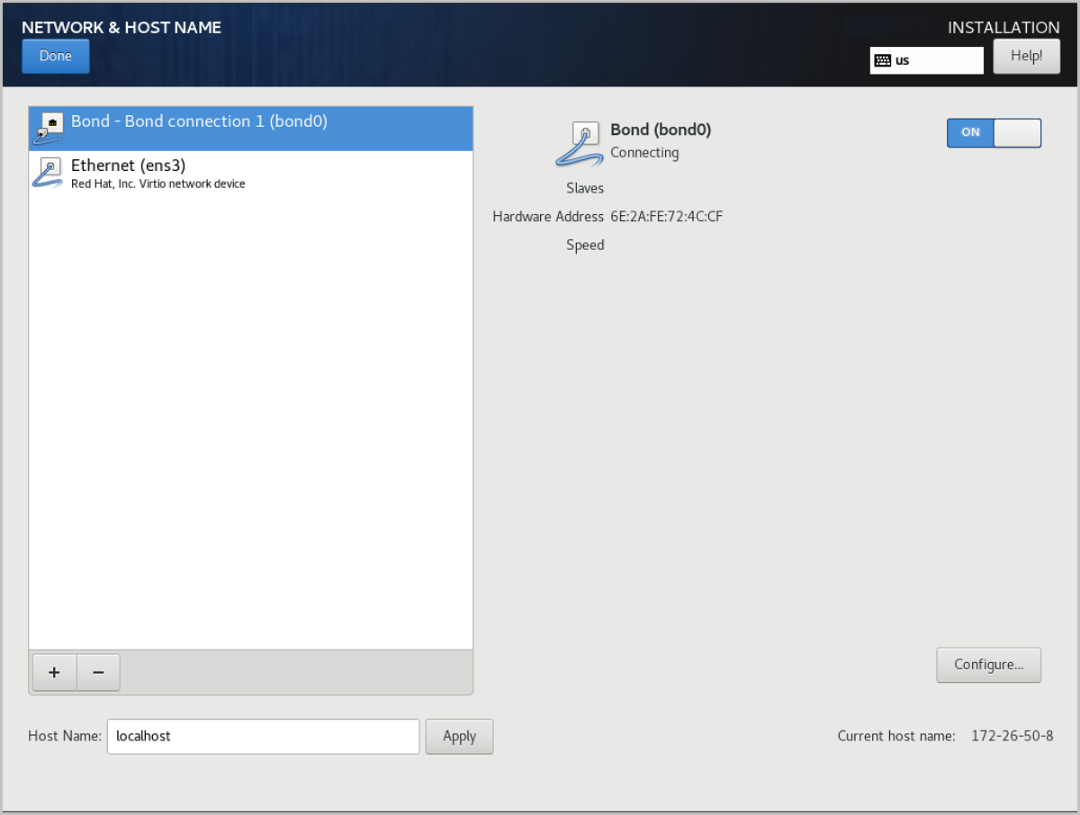 # Create a link aggregation virtual interface in LACP mode zs-bond-lacp -c [bond-name] zs-bond-lacp -c bond0 # Create another link aggregation virtual interface in active-backup mode zs-bond-ab -c [bond-name] zs-bond-ab -c bond0 # Bind the physical interface to the link aggregation interface zs-nic-to-bond -a [bond-name] [nic-name] zs-nic-to-bond -a bond0 ens3 # Create a VLAN interface zs-vlan -c [nic-name] [vlan] zs-vlan -c bond0 10 # Create a network bridge, and configure the network IP address for the network bridge zs-network-setting -b [interface] [ipaddress] [netmask] [gateway] zs-network-setting -b bond0.10 192.168.1.10 255.255.255.0 192.168.1.1On the INSTALLATION SUMMARY page, choose . Then the eth0 configuration page is displayed. Click the plus sign (+) at the lower left, select Bond from the prompted Add device drop-down list, and click Add.