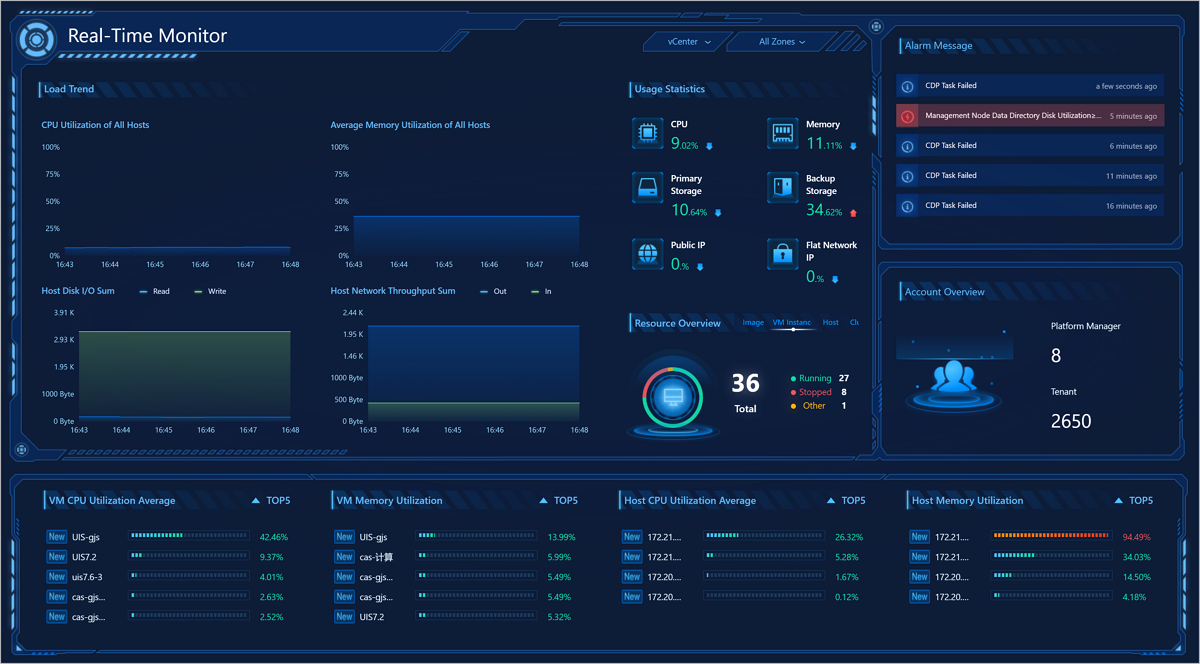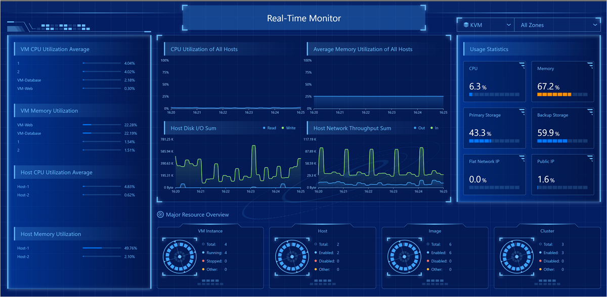The monitor collects usage statistics on the CPU, memory, disk, and network resource of all hosts of the data center in the selected hypervisor and zone, and provides real-time monitoring on the CPU utilization of all hosts, memory utilization of all hosts, host disk I/O sum, and host network throughput sum respectively. The monitoring results are displayed in the form of dynamic graphs in real time, and monitoring items are differentiated by colors, which can visually present you the resource utilization and performance status of all current hosts.
