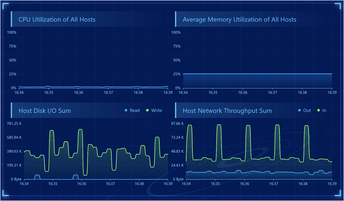 The monitoring results are displayed in the form of dynamic graphs in real time, and monitoring items are differentiated by colors, which present you the resource utilization and performance status of all current hosts.