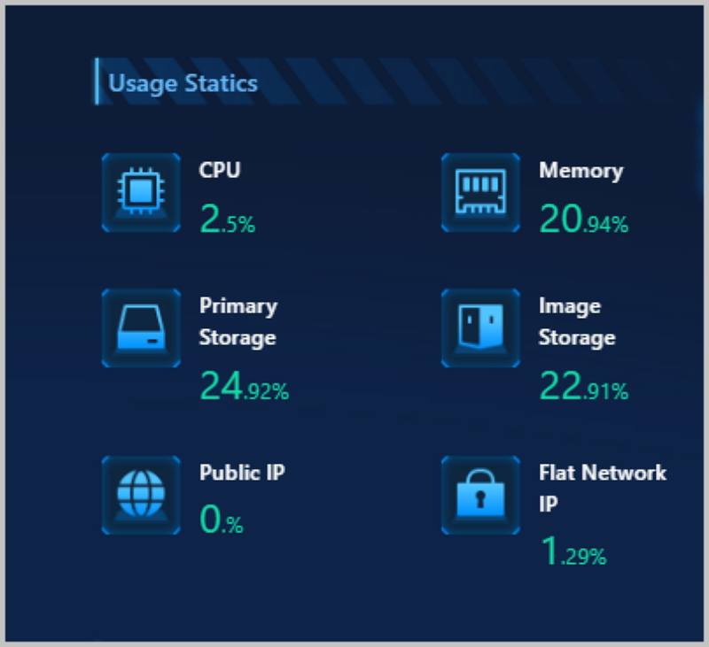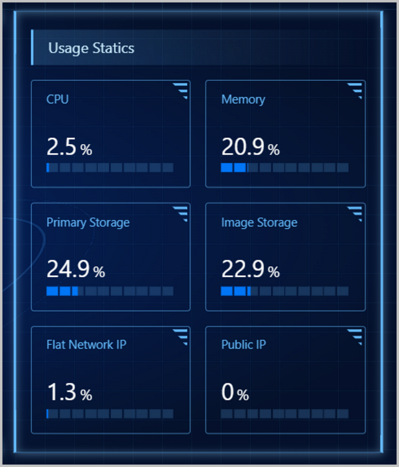 The monitor collects usage statistics on relevant physical resources of the data center in the selected hypervisor and zone, and provides real-time monitoring on the usage of CPU, memory, primary storage, image storage, private IP, public IP, GPU, vGPU, and others. The resource usages are displayed in real time and indicated by blue, yellow and red progress bars, so that you can easily know the resource utilization at the moment.