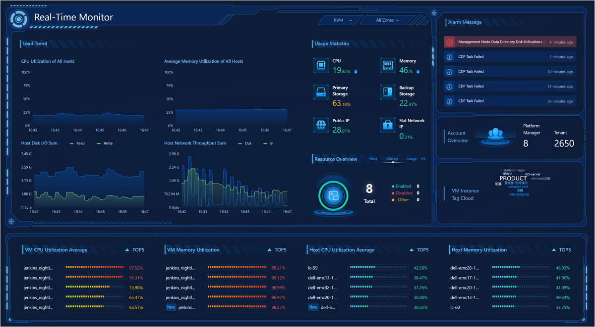 The monitor collects usage statistics on the CPU and memory of VM instances/hosts in the selected hypervisor and zone, and displays the top 5 of VM instances or hosts in real time based on VM CPU utilization, VM memory utilization, host CPU utilization, and host memory utilization.