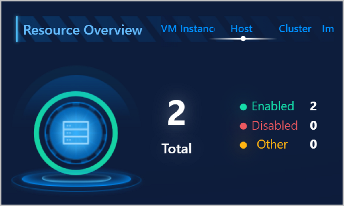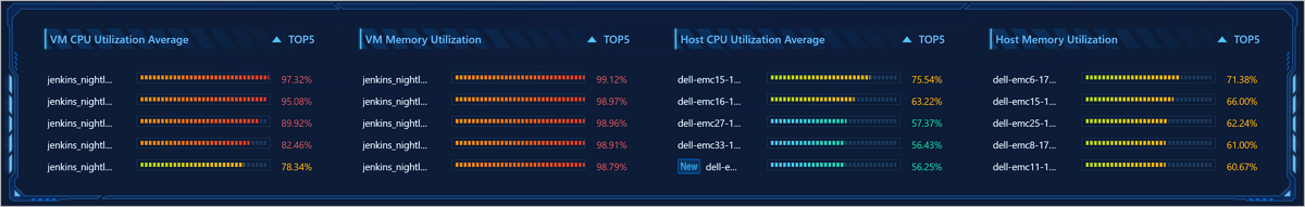 The monitor collects usage statistics on the CPU and memory of VM instances/hosts in the selected hypervisor and zone, and displays the top 5 of VM instances or hosts in real time based on VM CPU utilization, VM memory utilization, host CPU utilization, and host memory utilization. The top rankings are displayed in real time and indicated by blue, yellow, and red progress bars, so that you can easily know what resources are running out at the moment.