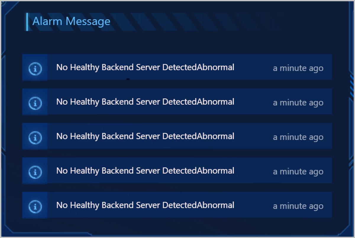 The monitor collects alarm messages set in ZStack Cloud and pushes the latest five alarm messages to the monitor display, which can intuitively inform you of the current risks in the Cloud.