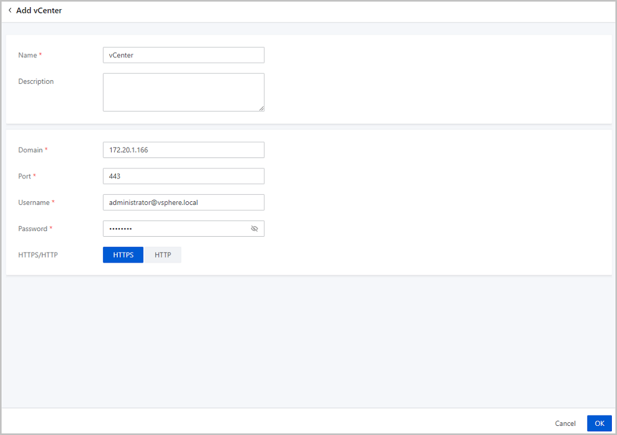 On the main menu of ZStack Cloud, choose . On the Basic Resource page, click Add vCenter. Then, the Add vCenter page is displayed.