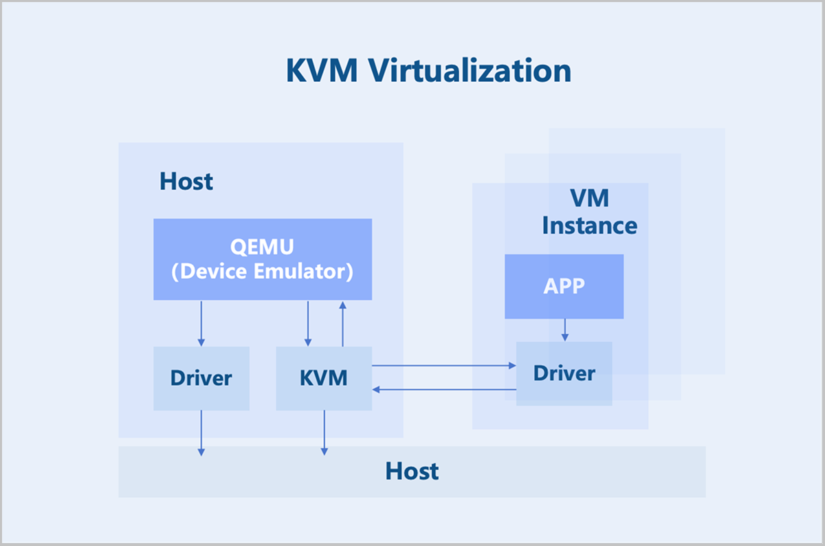 ZStack Cloud adopts a KVM-based hardware virtualization technology. As a Linux kernel module, KVM turns the Linux kernel into a hypervisor. KVM operates as a process within the Linux system and is scheduled by the standard Linux scheduler. As a result, KVM can leverage existing Linux kernel functionalities, such as memory management and CPU scheduling. However, KVM itself only provides CPU and memory virtualization. I/O device virtualization requires QEMU for full functionality. QEMU is a user-mode device emulator that provides virtual device models for VM Instances. It is responsible for creating, calling, and managing various virtual devices.