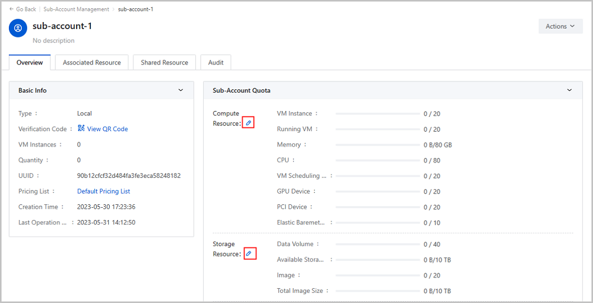 The Cloud assigns default resource quotas for each local sub-account. You can customize the quotas to fit your needs. To modify the quotas, navigate to the Sub-Account page and click on a sub-account to access its details page. Under the Sub-Account Quota section, you can see the resource quotas, or the upper resource limit, available to the sub-account. Select a resource type and adjust the quota as needed.