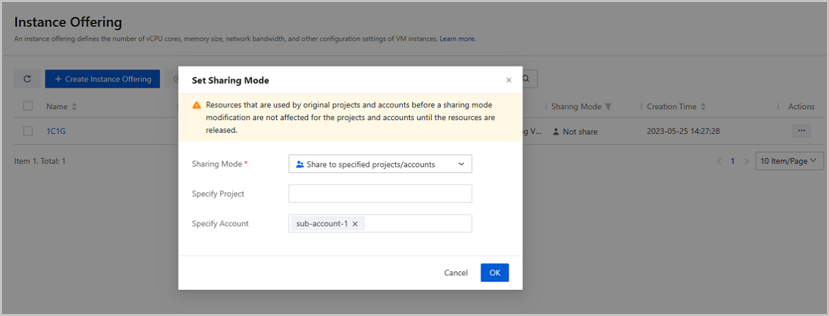 By default, the resources created by the admin, including instance offerings, images, and networks, are not shared with sub-accounts. For a sub-account to create a VM instance, the admin must first share these resources with the sub-account. Here is an example of how to share an instance offering, and the same steps can be followed for other resources.
