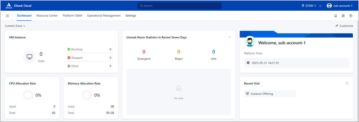 Note: When you use a sub-account to create a VM instance, you need to either use the admin account to share relevant resources including instance offerings, images, and networks, or create/upload new resources using the sub-account.ZStack Cloud supports seamless access to OIDC authentication systems, allowing OIDC sub-accounts to log in to the Cloud without the password and manage cloud resources.