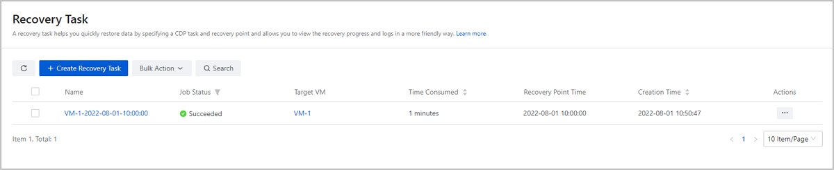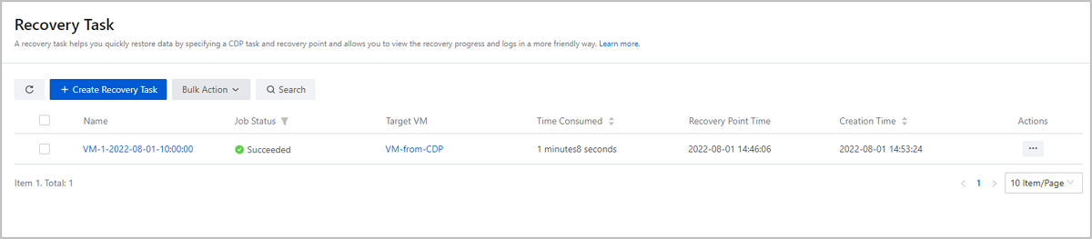 On the main menu of ZStack Cloud, choose . Then, the Recovery Task page is displayed. On the Recovery Task main list, you can view the job status, target VM, time consumed, and other information.