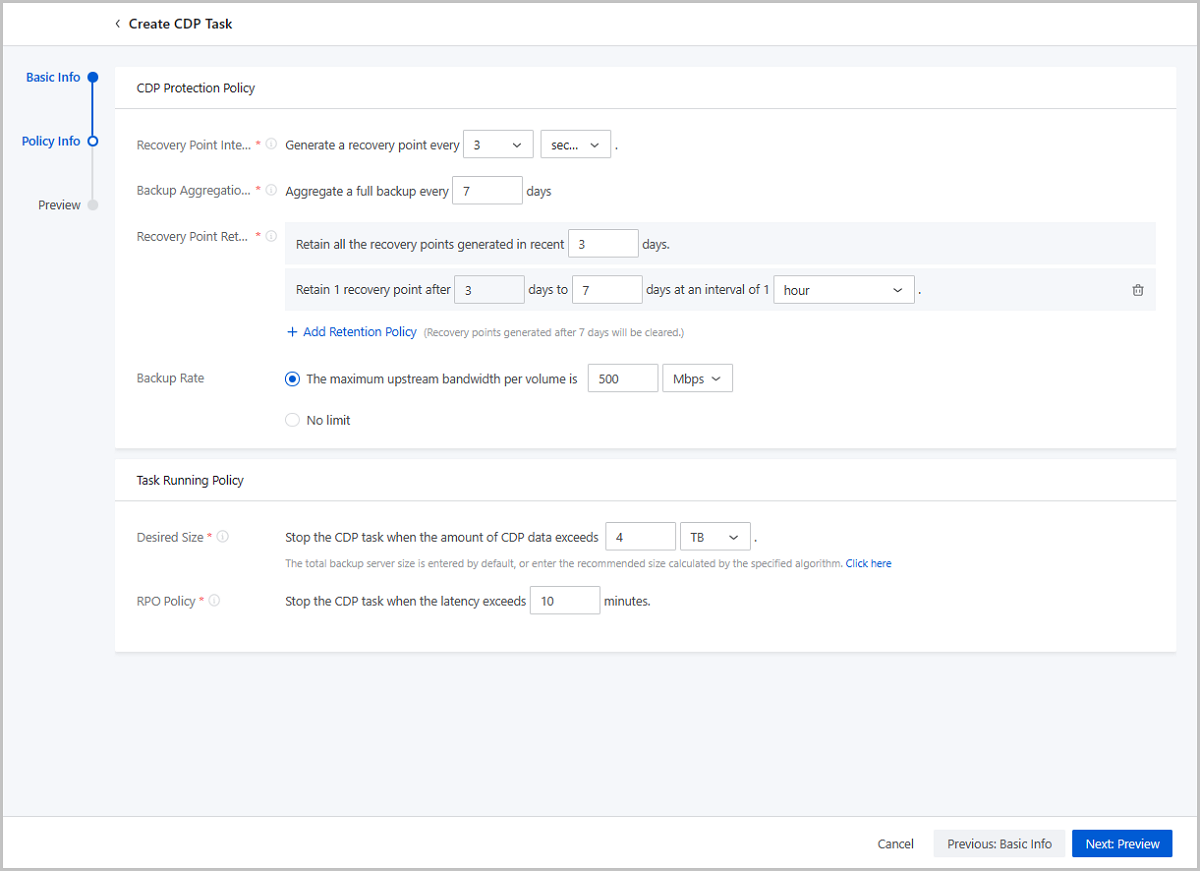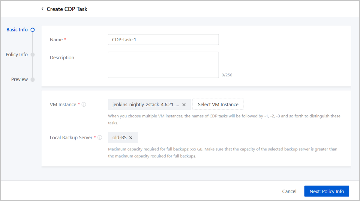 On the main menu of ZStack Cloud, choose . On the CDP Task page, click . Then, the Create CDP Task page is displayed.