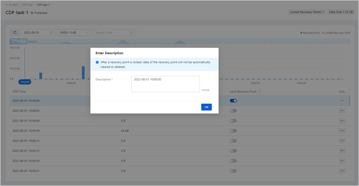 On the CDP Data tab page, choose one column (10:00:00 - 10:59:59), and click the corresponding arrow icon on the right of the list. Then, the recovery point list is displayed. On the recovery point list, choose one recovery point (10:00:00), and select the corresponding Lock Recovery Point checkbox. Then, enter a description for the locked recovery point.