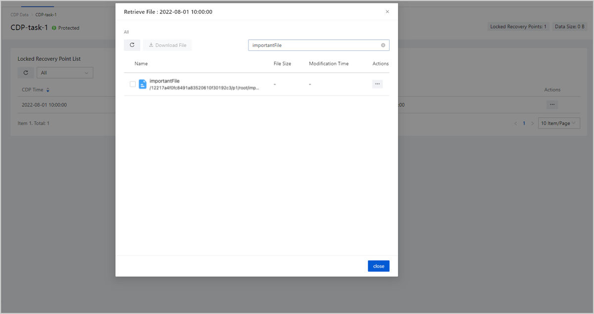 On the main menu of ZStack Cloud, choose . Then, the VM Instance page is displayed. On the CDP Data tab page, view the data for any time period on 2022-08-01 (for example, 2022-08-01 10:00:00), and click Retrieve File. On the displayed Retrieve File page, enter importantFile in the search box to find it. You can find that the file is contained in the current recovery point.