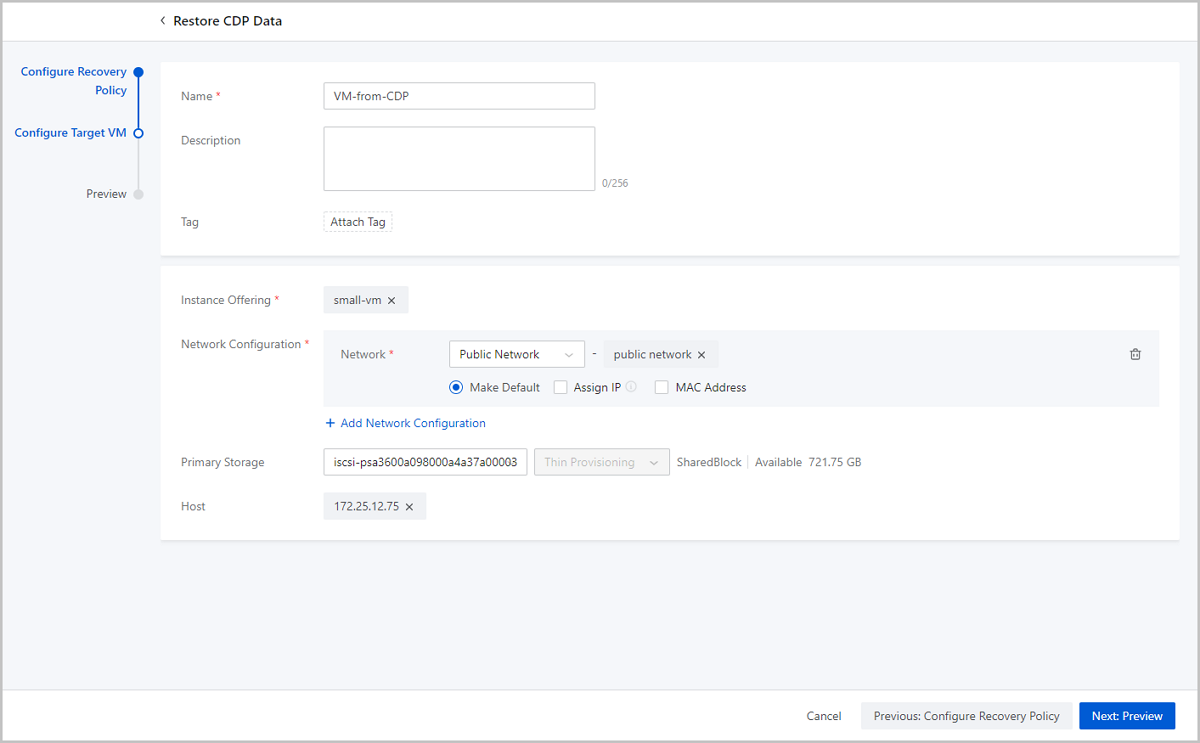 Note: If the VM instance has attached a SharedBlock volume, the provisioning type will set to thick provisioning by default when recovering data.