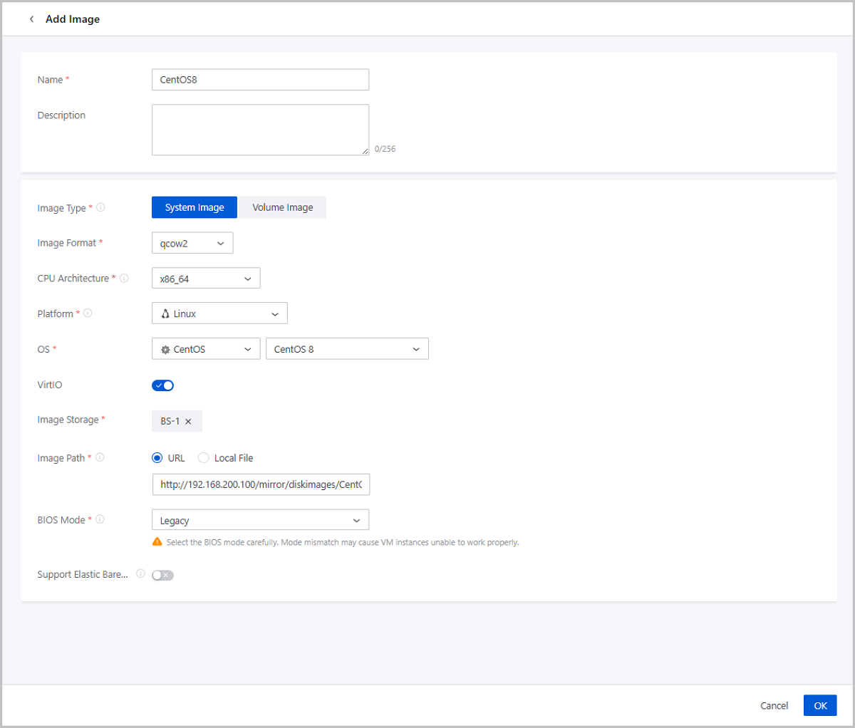 Note: When you add a local file as an image, your local browser is serving as a transit point to upload the image. Do not refresh or close the current browser, nor stop the service of the management node. Otherwise, the operation may fail.