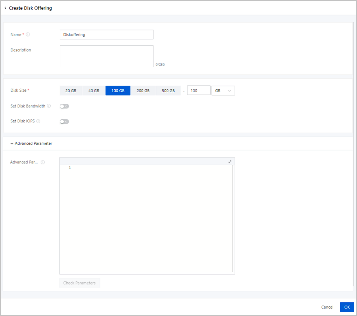 On the main menu of ZStack Cloud, choose . On the Disk Offering page, click Create Disk Offering. Then, the Create Disk Offering page is displayed.