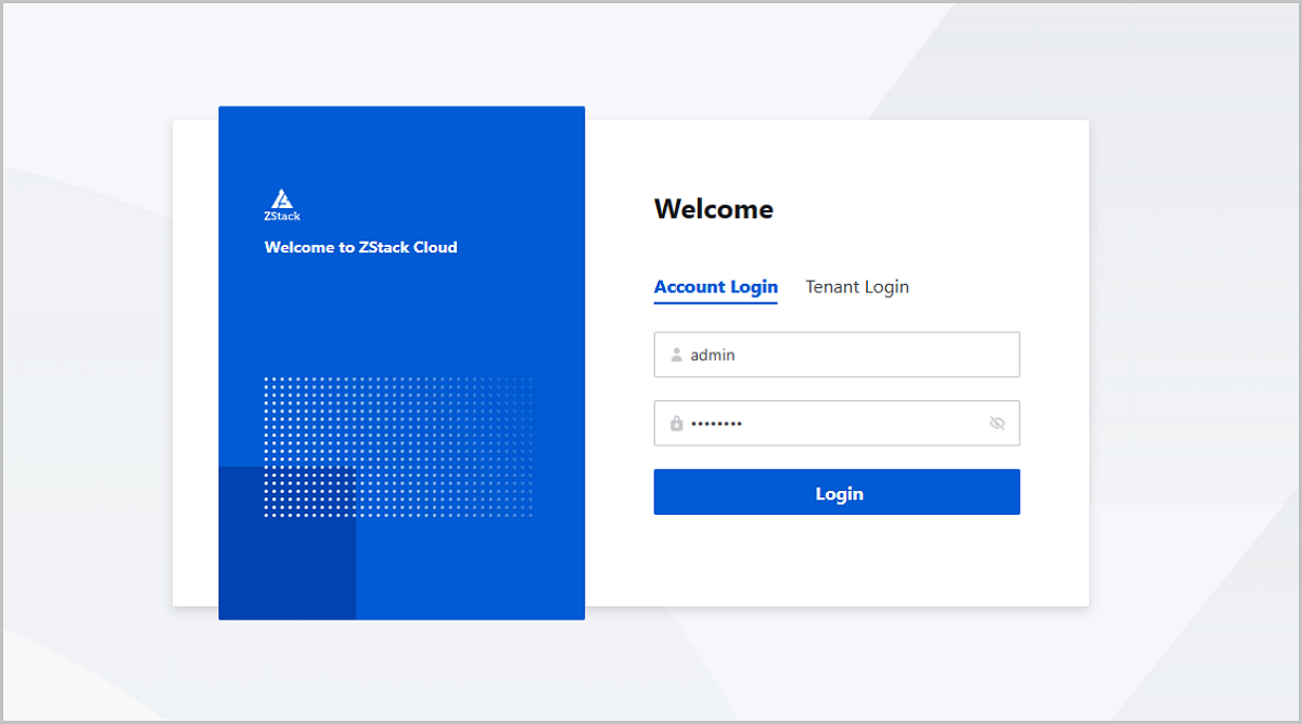 By using Chrome or Firefox, go to the Account Login page via http://management_node_ip:5000/#/login. To log in to the Cloud, the admin must enter the corresponding user name and password.