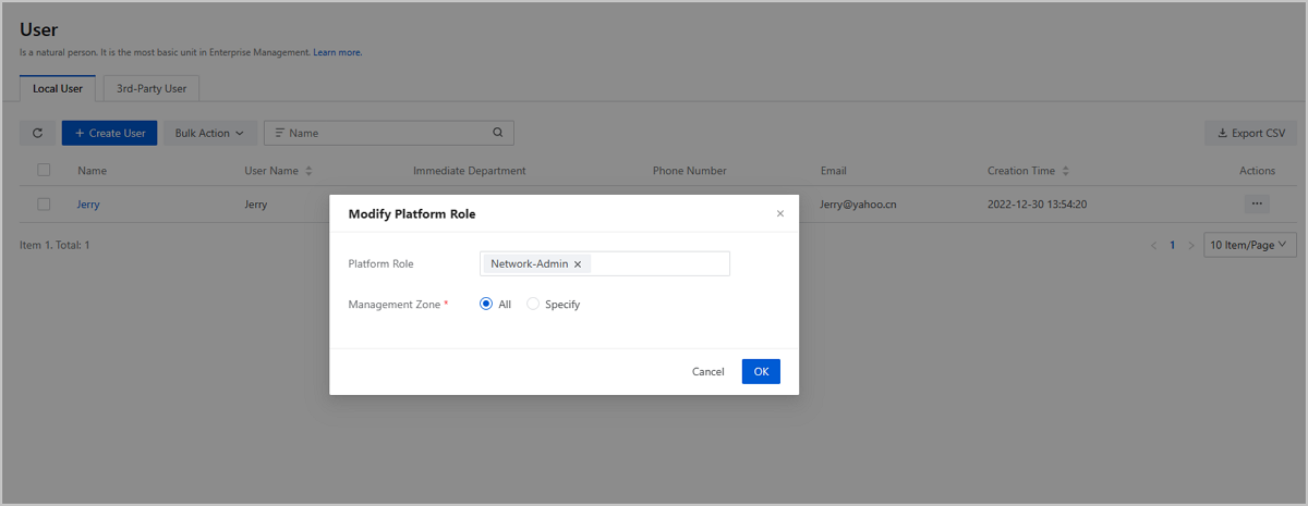 On the User page, choose the user Jerry, and click . On the Modify Platform Role page, click OK button to attach the role of network admin to the user named Jerry.