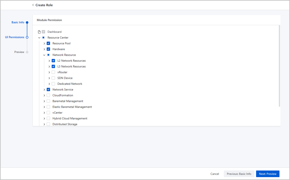 On the main menu of ZStack Cloud, choose . On the Role page, click Create Role. The Create Role page appears.